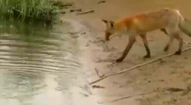 Молодая рыжая лисичка захотела достать большой лакомый кусок свежей сомятины из речки, но после долгих стараний то ли интерес у неё пропал, то ли посчитала рыбку не достаточно свежей