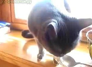 Кошке дали с ложечки съесть вкусную сладкую пасту, и она от удовольствия во время еды издаёт забавные звуки
