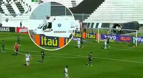 Меткий футболист запулил мяч во время спортивного матча прямо в открытое окно автомобиля скорой помощи, водителю на колени