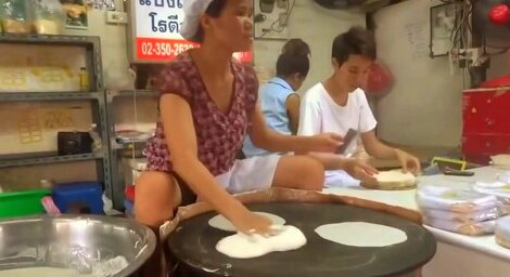 Удивительно здорово и ловко женщина выпекает сверхтонкие блинчики для быстрого азиатского кушанья, приготавливаемого прямо на улице