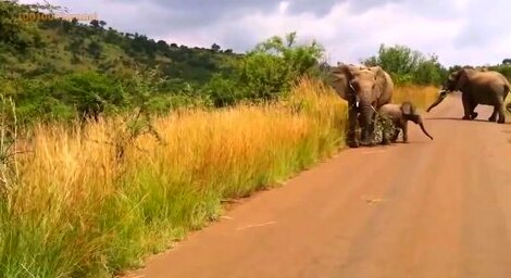 Прелестный слонёнок пытается вести себя, как взрослый разъярённый слон, атакуя машину с туристами, прячась в траву и снова атакуя в Национальном парке Крюгера в Южной Африке, пока не появляется взволнованная мамаша с большой веткой и уводит слонёнка