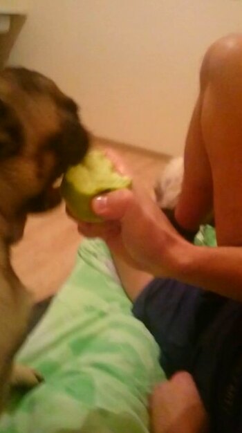 Удивительный пёсик породы мопс, который очень любит зелёные яблоки - он готов есть их целыми днями напролёт. особенно, из рук своих хозяев