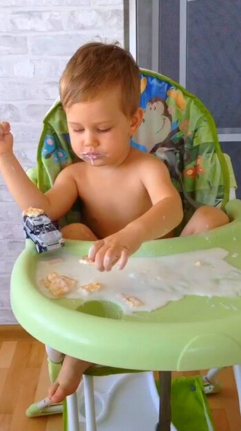 Печенье в молоке на детском столике - отличный плацдарм для игры с машинкой. Можно одновременно и перекусить, и вообразить себя водителем автомобиля на бездорожье