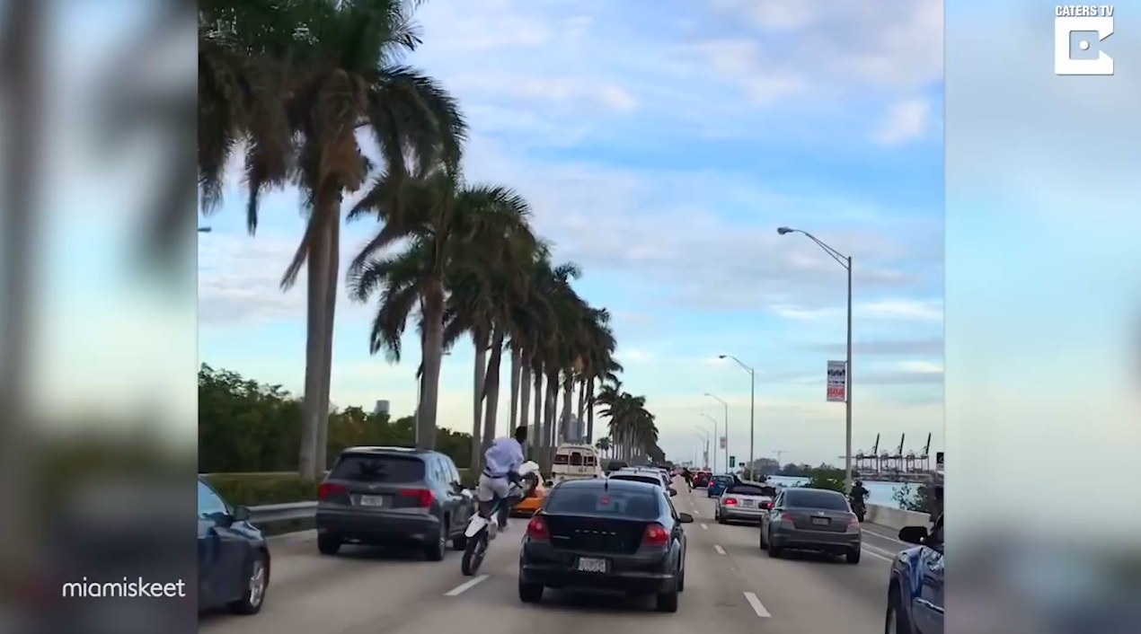 Волнительный и сложный, но при этом в его исполнении красивый и чёткий трюк в виде езды на мотоцикле на его заднем колесе, при этом лавируя между многочисленных автомобилей на проезжей части