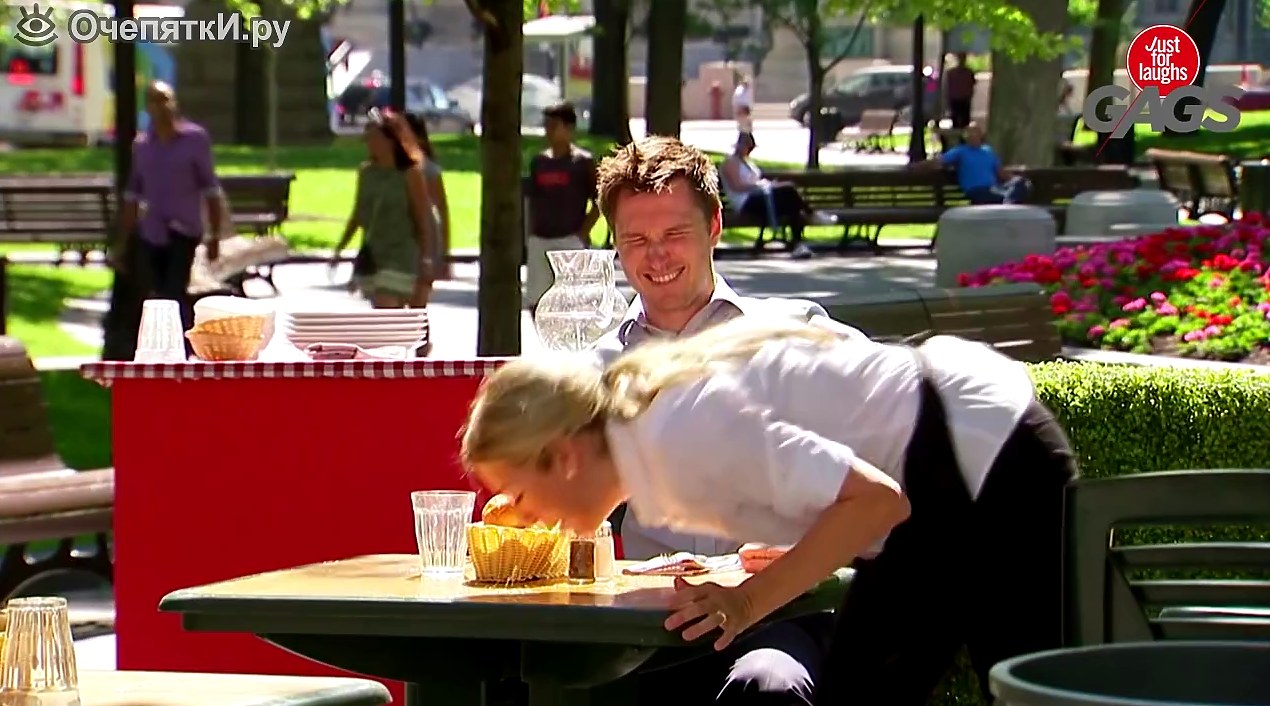Очень неожиданный сюжет для розыгрыша посетителей уличного кафетерия придумали канадские артисты и сценаристы из трупы "Смеха ради" - посмотрите, как они обыграли сценку с мокрым мусором, который попал на стол с едой